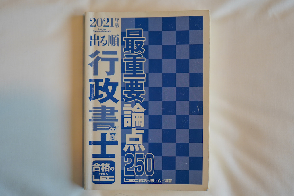 LECの『出る順行政書士 最重要論点250』は、試験範囲のうち合格に必要な重要論点が250項目にまとめられており、試験数ヶ月前からの総まとめツールとして活用できます。私は、LECさんの講座を活用しながら、暗記本は『最重要論点250』を使いました。