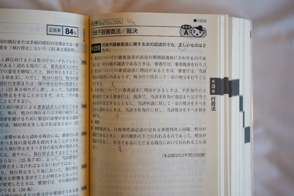 直前期になると、9月に「全日本行政書士公開模試」と10月に「ファイナル模試」があります。模試は会場受験と自宅受験ができます。一般的には本試験と同じ緊張を感じられる会場受験が推奨されますが、私は自宅受験にしました(これといった理由はないのですが出不精なのです…汗)。