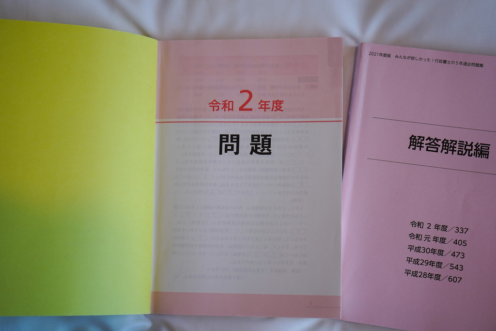 使うのは、年度別過去問です。多くの過去問題集は科目別に並んでいますが、『みんなが欲しかった! 行政書士の5年過去問題集』(TAC)は年度別に並んでいるので、普段は他の過去問を使って学習している方も、直前期は本書を買って練習するのをおすすめします(私も使っていました)。