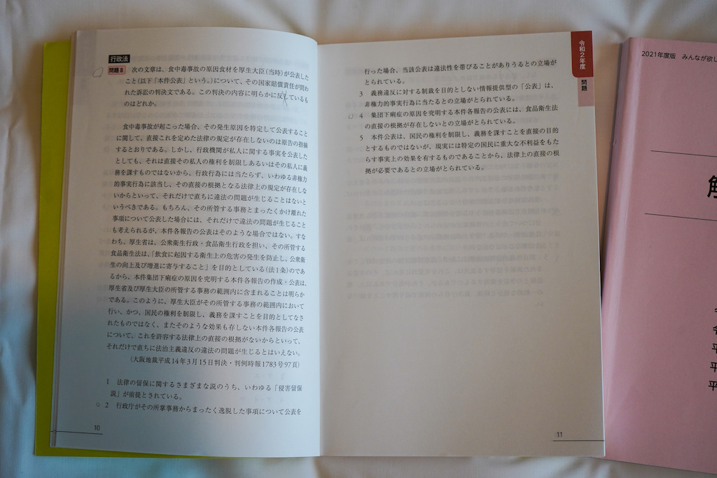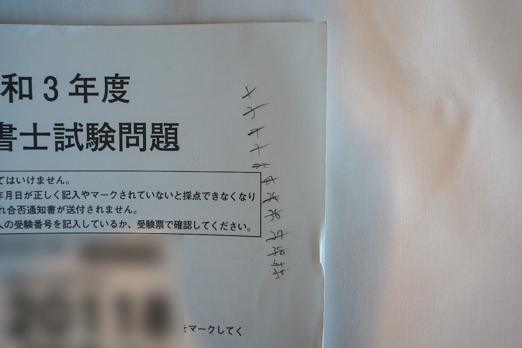 また、同時に正誤も確認しましょう。記述式を除いた57問の点数がとれているかを確認すれば、記述式でどのくらい点数が必要か、一般知識等はどのくらい点数がとれるかといったことがわかります。記述式の配点はブラックボックスですが、回答例を見ながら、配点を予想してどのくらい点数が取れていたかを予想するのも良いでしょう(タイトに点数をつけると本番がラクに感じるはずです)。